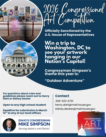Last but not least, I'd like to invite high school students across Idaho's Second District to enter the High School Congressional Art Competition. Students who enter the competition will have a chance to win a trip to DC to attend a special reception and see their artwork displayed in the Capitol for everyone to see! Deadline is March 13th. Learn more here.